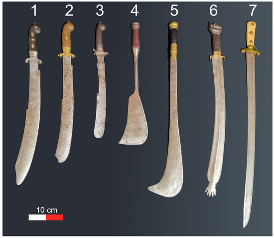 Based on a provenance preceding UNESCO’s 1972 Convention concerning the Protection of World Natural and Cultural Heritage, six Dahomean swords were selected for this research (Figure 2, swords 1 to 6). These objects were collected privately from owners in France, Dahomey’s colonial overseer from 1894 until its independence in 1960. Most of these swords had resided for decades in one old collection in Orleans. All had morphological characteristics that identified them as Dahomean, based on the few existing studies of Dahomean swords and related Dahomean objects [4,5,6]. Europe’s cultural and material influence on Dahomey was particularly evident in the design of Dahomean edged weapons [4]. Typically, some of the six samples studied here show pronounced European influences, resembling the cutlasses used by the European sailors that Dahomeans encountered from the time of the kingdom’s emergence as a major regional power. A couteau de chasse, a sword type used as both a maritime cutlass and a hunting sword in Europe, exemplified here by sword 7, has been included in the study for comparative purposes. This sword type inspired many of the features in swords 1, 2 and 3—from the style of guard, to the riveted hilt and even the clip-point blade [4,6].