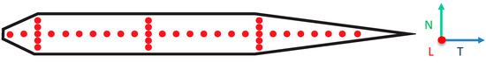 Although a full 2D mapping would be very desirable to spatially identified subtle variations in the blade cross-section, a compromise between resolution, number of measurement points and experimental time per point needs to be found. Therefore, only a limited number of one-dimensional scans were performed. However, the displacement and number of the measurement points (Figure 3) were selected in a way that would allow the distinction of relevant features in the blade.