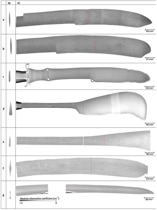 Normal (xy) and longitudinal (xz) tomographic reconstructed cross-sections of (a) sword 1, (b) sword 2, (c) sword 3, (d) sword 4, (e) sword 5, (f) sword 6, (g) sword 7. The dotted red line indicates the location of the xy section along the blade. A scale bar indicates the correspondence between gray tone and neutron attenuation coefficient.