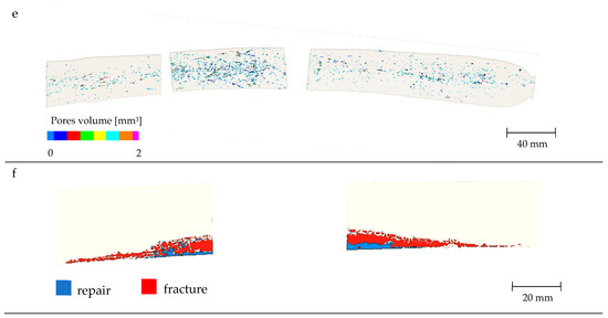 Three-dimensional map of the volume of porosities with the corresponding legend of colors are reported on the left side for (a) sword 2, (b) sword 3, (c) sword 4, (d) sword 5, (e) sword 6, (f) sword 7.