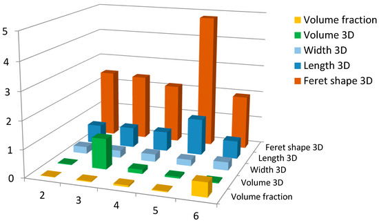 This table lists the different parameters for porosities in samples 2–6. The Feret shape 3D indicates the ratio D/d, where d is the minimum Feret diameter (a one-dimensional measurement that estimates how “wide” an object is in a given direction) and D is the maximum Feret diameter in the orthogonal direction; the length 3D refers to the maximum of the Feret diameters; and the width 3D to the minimum of the Feret diameters. The volume 3D represents the three-dimensional size of pores detected. Mean, standard deviation, minimum and maximum values are reported for each shape component.