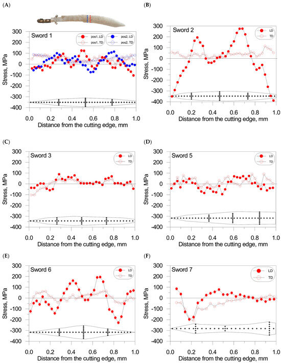 Central line profiles of the longitudinal and transversal stress components are reported for 6 blades (A–F). Since the samples differ in size, all curves are plotted in the scale normalized to 1 to make results geometrically comparable. The stresses were measured with an accuracy of <15 MPa. The samples also show variations of shape in cross-section; therefore, the two-dimensional mesh adopted for the stress measurement experiment complements each graph. The stress profiles for sample 1 (A) measured in two different positions of the blade length are reported together. The positions of the two cross-sections are mapped as red and blue dotted lines on the photographic image of the blade at the top.