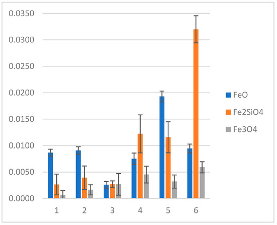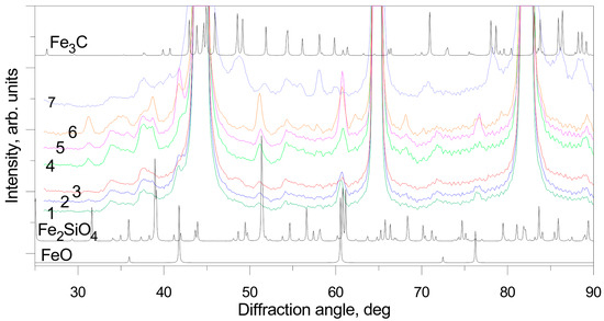 Instead, all other samples, excepting sword 7, showed presence of wüstite (FeO, iron(II) oxide) in different amounts—as reported in Table 4 and graphically represented in Figure 9—and ranging within 1–2 wt%. An attempt was also made to fit the patterns using hematite (Fe3O4), but only sword 6 showed some trace amount of it, ~0.6 wt%. The presence of magnetite (Fe2O3) was not found. Moreover, for swords 4, 5 and 6 an additional phase, fayalite (Fe2SiO4), was found in an amount larger than 1 wt%. The original experimental diffraction data are shown in Figure 8 for easier comparison, together with the calculated individual phase patterns for easier peak identifications and judgement of relative intensities.