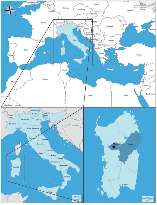 The town of Macomer, located in the mid-west of Sardinia (Italy), approximately 30 km from the coast (40°15′51″ N 8°46′30″ E, 563 m a.s.l.) (Figure 1) has Punic origins. In the 3rd century BC, the city was conquered by Romans that took advantage of its strategic position in the center of the Island.