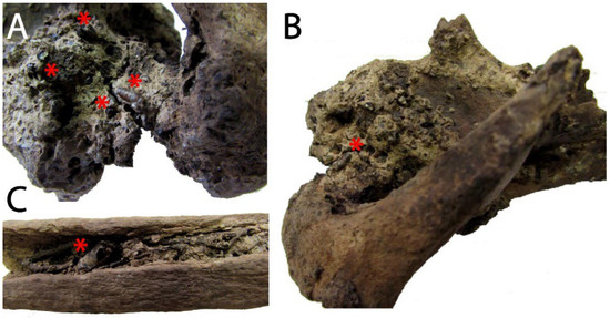 In 2018, during a detailed examination of the human remains, most of which exhibited a dark coloration and bluish spots, the presence of several non-human elements was revealed on (Figure 3A) and inside (Figure 3B,C) the bones [51].