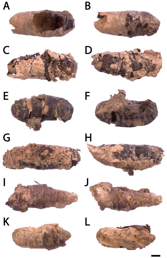 Mold/cast mineralized puparia extracted from human bones. Different levels of preservation are shown. The organic cuticle was patched and still attached to the mineral component (A,B,I–L) or complete (C–H). Scale bar: 1 mm.