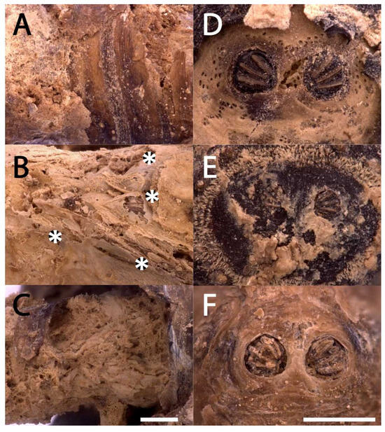 Details of mineralized puparia. (A) Striped pattern of the dorsal side of the puparium, (B,C) compact and fibrous structure of the mineral casts and (B) microtrichosity of the dorsal. (D–F) Calliphoridae posterior spiracles. Scale bars: 500 μm.
