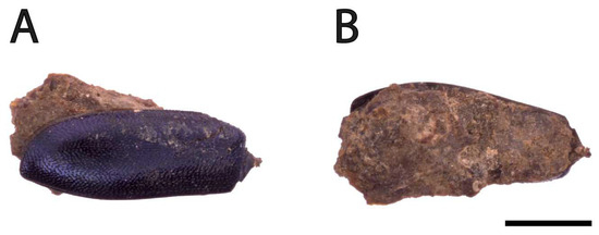 The majority of the entomological remains (around 20 specimens), identified as Diptera puparia, both hatched and closed, were found nested inside the bone’s “marrow cavity” (Figure 3C). Other specimens (around 10 specimens) were found in the bones’ cavities adhered to mud and soil sediments (Figure 3A,B).