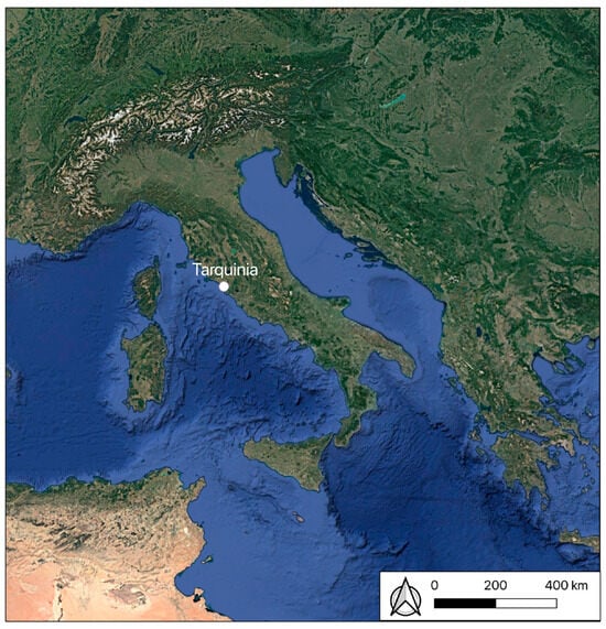 Tarquinia was one of the most prominent coastal cities of Etruria on the Tyrrenic versant, alongside Cerveteri to the south and Vulci to the north (Figure 1). Since 1982, the “Tarquinia Project” has conducted extensive excavations on the Civita plateau (an elevated area about 10 km from the coast), which hosts two archaeological sites dated to the Estruscan period: the ’monumental complex’ and the Ara della Regina sanctuary, both with a religious and ritual vocation [15]. The Ara della Regina is the sanctuary area, inside which a temple dedicated to Tarconte and dated to the 6th century BCE has been discovered [16]. The sample is from the area of the ‘monumental complex’, which traced the origins of Tarquinia back to the Bronze Age (early 10th century BCE) and prompted the urbanisation of the area. Central to this early phase was a natural cavity, referred to as the mundus, whose connection with the chthonic sphere transformed the area into a sacred and institutional hub, highlighting Tarquinia’s pivotal role in Etruscan religious life. The sanctity of the area is further emphasized by the burial (in the area alpha) near the cavity of an eight-year-old child (Individual 1) with signs of encephalopathy and epilepsy, dating to the 10–9th century BCE, whose resemblance to the mythological figure Tagetes has been the subject of study [17]. The area was monumentalized beginning in the Orientalizing period (early 7th to early 6th century BCE), with the construction of an altar-temple measuring 6.5 by 11 m (edificio beta), incorporating distinct Near Eastern architectural influences, and dedicated by a priest-king to the most important goddess of the Etruscan pantheon, Uni. By the 6th century BCE, the ’monumental complex’ had become a prominent site for communal gatherings and remembrance, maintaining its ritual significance. During the early 5th century BCE, the complex was redesigned with a new North–South pathway, incorporating an underground tunnel (cuniculus) covered with stone slabs. Recent discoveries, now being published, are shedding light on the Hellenistic period and continuity of ritual practises. Later phases, including a hypogeum built in the Augustan period and reused for burials in the 8th century CE, remain under study. However, these later developments lie beyond the primary focus of this research.