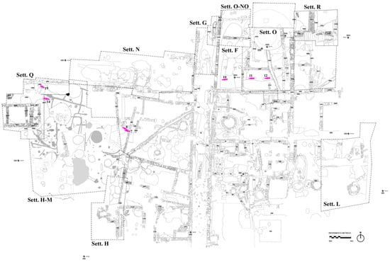 General plan of the ‘monumental complex’, including the discussed depositions. The depositions are indicated in pink.