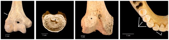 Photographic images of the biomechanical stress markers observed in this study (indicated by the arrows and asterisks). From left to right: marked entheseal changes at the insertion of the brachioradialis muscle of the right humerus (skeleton 8), Schmorl’s node on a vertebral body (skeleton 12), knee osteoarthrosis on the left distal femur (skeleton 19), and mandibular dental wear (skeleton 12).