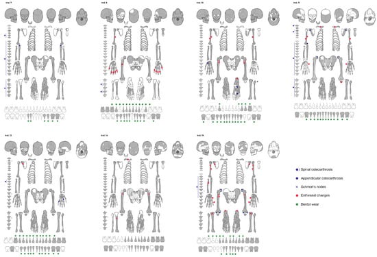 A description of the individuals present in this study will be provided one by one. Table 1 presents the details of the markers of mechanical stress observed for each skeleton. Figure 3 illustrates the lesions observed, whereas Figure 4 shows the state of preservation of the skeletons studied as well as the location and type of the lesions reported.
