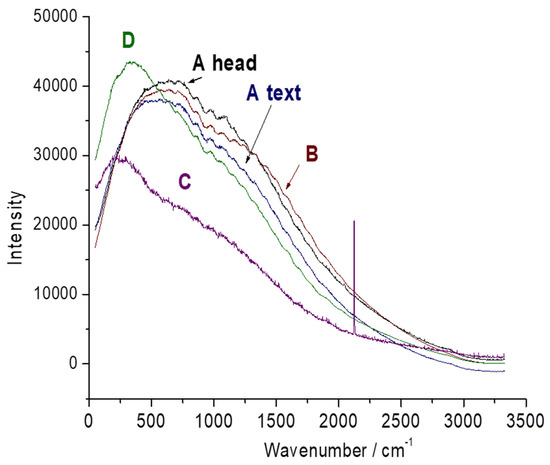 Comparison of the luminescence background of the paper supports of TYPE A (impression of Christ head—labeled Ahead; and accompanying letter—labeled A text), TYPE B, TYPE C, and TYPE D recorded with 785 nm laser excitation. The peak on a pixel around 2120 cm−1 is due to a cosmic ray unrelated to the studied object.