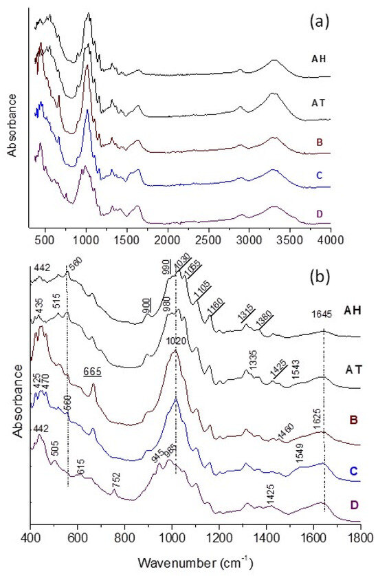 FTIR spectra obtained from the paper supports of TYPE A (both impression—labeled AH—and accompanying letter—labeled AT), TYPE B, TYPE C, and TYPE D (a). Bands related to cellulose are underlined (b).