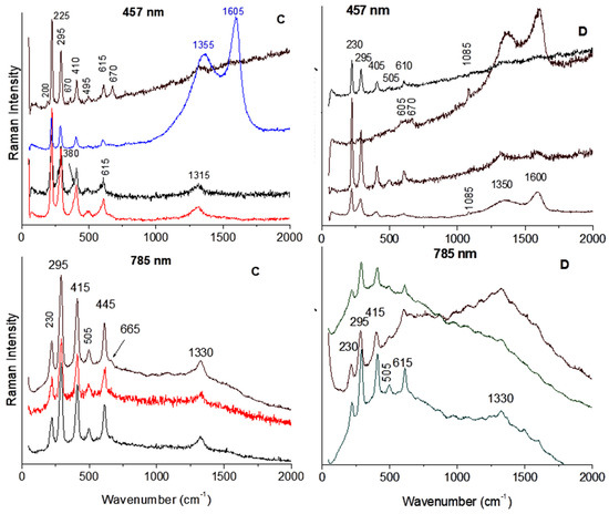 Concerning the red color, various spectra were collected from different areas to have a wider panorama as far as variability is concerned. Raman spectra obtained on the red pigments are shown in Figure 6. They clearly prove to be consistent with the presence of hematite (alpha Fe2O3). The relative intensities of the peaks at ~225, 295, 415, 505, 445, 615, and 1315 cm−1 [10] slightly depend on the excitation laser due to the resonance character of the Raman scattering under green laser excitation.
