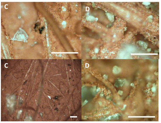 The XRF measurement areas were documented by using a Digital Optical Microscope (DOM). Specifically, high-resolution photographs in visible and UV LED (50× magnification) were acquired by using a DinoLite AM4113TFVW, characterized by a resolution of 1.3 megapixels; magnification of 10×, 50×, and 200×; equipped with 4 UV light-emitting diodes (LEDs) with an emission of 400 nm+; 4 integrated white LEDs; a color CMOS sensor; manual calibration; and a measurement accuracy of approximately ±3 µm. The DOM allowed preliminary observation of the black and red layers and related conservation state. All reported microscopies were acquired by keeping the microscope in contact with the surface (at a fixed distance and 50× magnification).