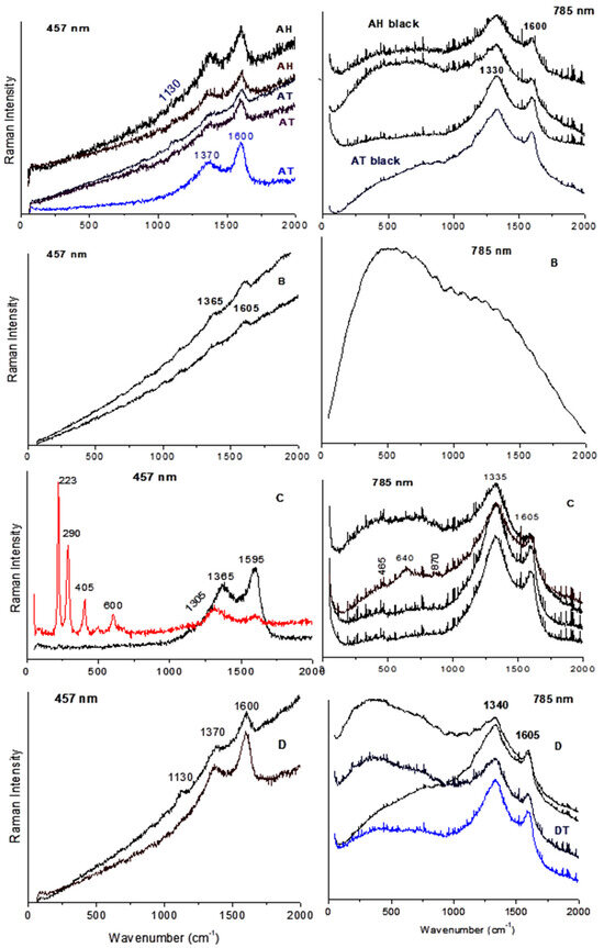 Comparison of Raman spectra for the black pigment analyzed on TYPE A (both impression—labeled AH—and accompanying letter—labeled AT), TYPE B, TYPE C, and TYPE D, recorded with 457 (left) and 785 nm (right) laser excitation. Counting times are very short (a few tenths of seconds for spectra recorded with 457 nm and 0.1 s for 785 nm) in order to avoid degradation of the colored area under the laser beam.