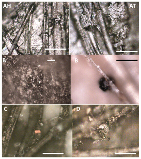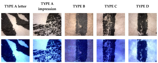 Comparison of optical microphotographs: black areas on TYPE A (both impression—labeled AH—and accompanying letter—labeled AT), TYPE B, TYPE C, and TYPE D. Bar: 50 µm.