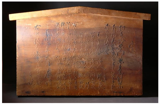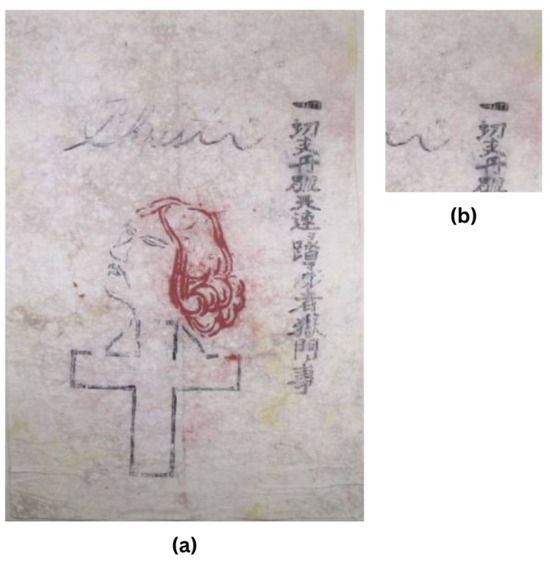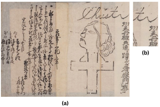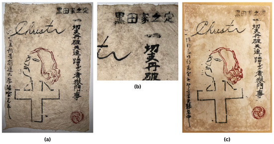 The details reported in the letter accompanying TYPE A also explain, for the first time ever, the presence of TYPE B (Figure 17) in the residence of the Kiyama family (discussed in Section 3.6.2); the headman of the Kiyama family told Kataoka that their ancestors held E-fumi sessions in the premises of their residence. Therefore, consistent with the letter herein analyzed, the Kiyama family ancestors, in their capacity as Village Headmen, kept, in the village archive, a copy of the official papers pertaining to the mandatory administrative duties each group of villages had to comply with in order to provide proof of the anti-Christian measures taken in the domain [1]. The paper images of the Bateren head, better identified here as Warning Signs, along with the Kousatsu (Notice Boards), were amongst the tools available for such a purpose.