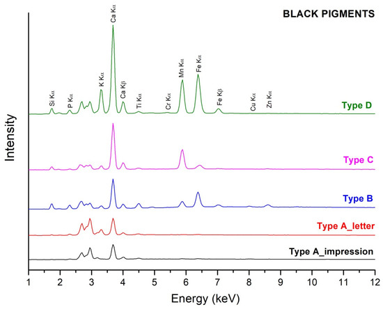 XRF spectra of the black pigments analyzed on TYPE A (both impression and accompanying letter), TYPE B, TYPE C, and TYPE D. N.B. The Mn content observed in the spectra of TYPE B and TYPE C comes from the paper support beneath the black pigment layer. The Mn detected on the black pigment of TYPE D belongs instead to the black pigment layer. The variable P content observed in all spectra belongs to the paper support beneath the black pigment. The Cr content observed in the spectrum of TYPE D comes from the paper support beneath the black pigment layer.