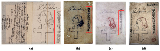 Let us now focus briefly on the overall composition of the print. The design layout of Type D (Figure 10) features a Christi lettering delimited on both sides (left and right) by vertical inscriptions. The top-right section of the print hosts the Kuroda family inscription.