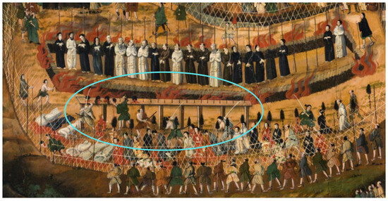 The detail of the Japanese painting in Figure 20, encircled in yellow, shows the severed heads of executed Christians being mercilessly exposed on a stand as by gokumon punishment in Japan from the 17th century.