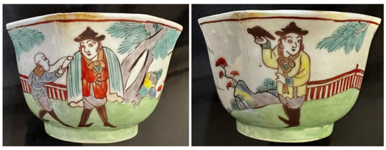 Details of a porcelain cup bearing the depicting of a Dutch person with an assistant and a Dutch falconer, Imari ware, overglaze enamels, late 18th-early 19th century (private collection).