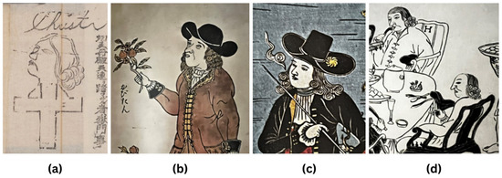 (a) TYPE A (impression); (b) detail of the hand-colored print ‘Picture of a Hollander’, mid-18th century *; (c) detail of the woodblock print ‘A Hollander with his Attendant and Dog’, late 18th-early 19th century *; (d) detail of the woodblock print ‘A Dutch Dinner Party’, 18th century *. * Adapted from [41].