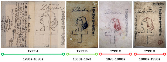 The alleged Kami Fumi-e herein studied consist of woodblock impressions depicting the head of a Bateren (a corrupt Japanese word for the Portuguese Padre: Priest) placed over a cross (Section 4), in one or two colors—that is, plain black (Type A and Type B) or black and red (Type C and Type D) (Figure 1, Table 1). Additional inscriptions also report edicts, places, authorities’ names, and dates to which they supposedly referred. The seal of the Kuroda family appears in red ink on many of them (Type D) and is sometimes accompanied by other random inscriptions and seals of unclear meaning and origin.