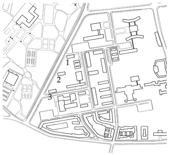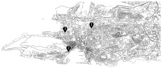 Plan of the City of Split. Buildings designed by Radić and analysed in this article are marked on the map by numbers: 1—residential towers in the residential settlement along Domovinskog rata Street, 2—mixed-use building on the West Coast of the Split City harbour, and 3—residential towers in the city district of Spinut. Source: Author’s archive.