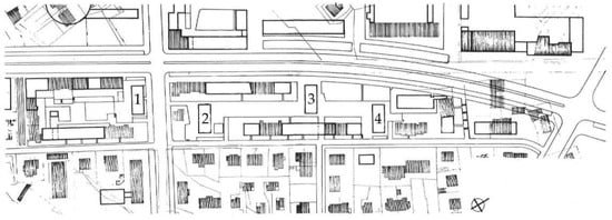 Residential settlement along Domovinskog rata Street, urban regulation. The residential towers designed by Radić are marked with numbers 1–4. Source: Author’s rendering of the illustration from the article [9] (p. 97).