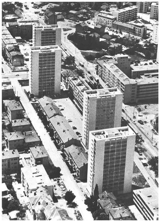 Residential towers along Domovinskog rata Street designed by Radić, view from the northeast. Source: Ref. [21] (p. 25).