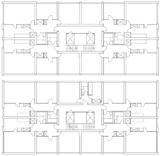 Residential towers along Domovinskog rata Street designed by Radić: “Army” residential tower, typical floor plan (top) and “Civilian” residential tower, typical floor plan (bottom). Source: Redrawn by the author in 2024 from a layout obtained from the National Archives in Split, HR-DAST-119 [43,44,45,46,47,48].