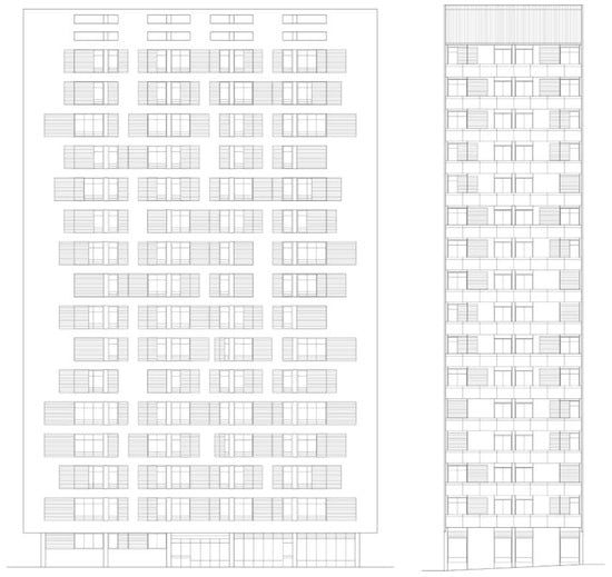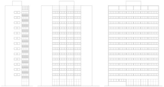 Residential towers along Domovinskog rata Street designed by Radić: east façade (left), north façade (middle) and south façade (right). Source: Redrawn by the author in 2024 from a layout obtained from the National Archives in Split, HR-DAST-119 [43,44,45,46,47,48].