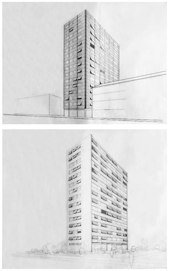 Residential towers along Domovinskog rata Street designed by Radić, perspective view from the west (top) and perspective view of the alternative façade solution from the west (bottom). Source: National Archives in Split, HR-DAST-119 [43].