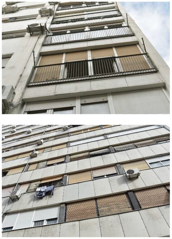 Residential towers along Domovinskog rata Street designed by Radić, windows on the north façade (top) and on the south façade (bottom), condition in 2025. Source: Author’s archives.