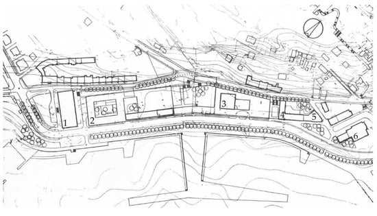 Regulation of the West Coast City harbour in Split. Banovina administration building (1), Pomorska privreda building (2), Hotel Marjan (3), architect Ivo Radić’s residential-commercial building (4), Čorak residential building (5) and Hotel Ambassador (6). Source: Author’s rendering of the illustration from article [52] (p. 96).