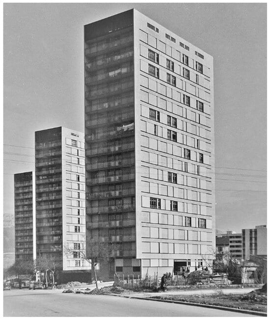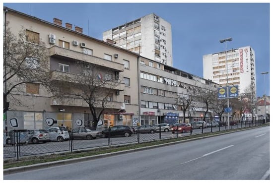 Rapid industrialisation and modernisation of society were features of the 1960s, common to the socialist as well as welfare state countries. The need for cost rationalisation and quick execution led to the industrialisation, standardisation and prefabrication of construction. The International style, which arose in architecture between the two world wars, entered its reduced form in the 1960s. The International style of the interwar period was characterised by the universality of the approach, which assumed the use of modern techniques and materials [40] (p. 248). By the beginning of the 1930s, through the series of buildings constructed all around the world, it was possible to glimpse the features of the new style, such as the use of simple, rectangular, often hovering volumes; avoidance of architectural decoration and use of transparent layers [41] (pp. 257–258). Some of the pioneers of this new style were W. Gropius, P. Behrens, L. Mies van der Rohe, Le Corbusier, J.J.P. Oud, R. Neutra and P. Johnson, while in the former Yugoslavia Drago Ibler, Stjepan Planić, Edvard Ravnikar, Juraj Neidhardt and Nikola Dobrović stood out. Nonetheless, in the 1960s, architecture was in many cases completely subordinated to the industrialisation of construction, which largely contributed to the box-like residential slabs appearing as a characteristic type of the time [41] (p. 549).