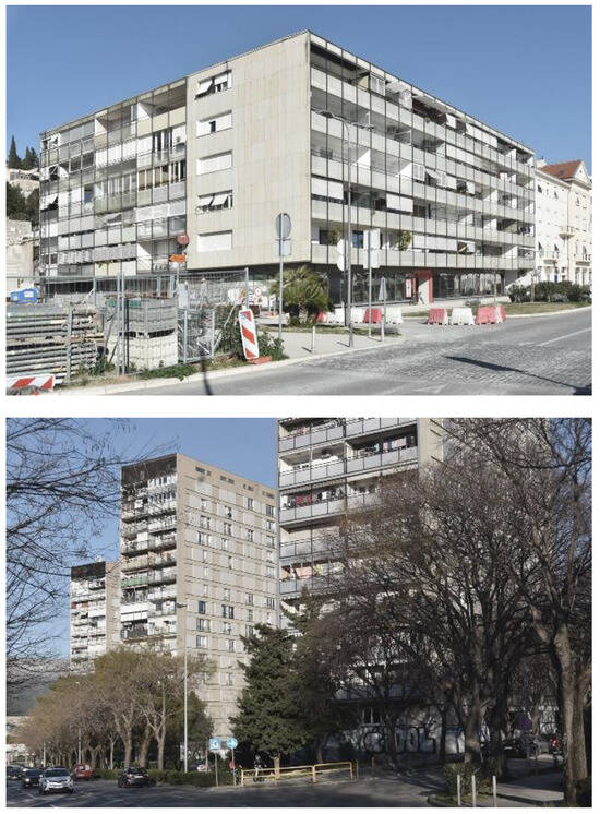 Only a few Croatian architects realised innovative details on residential buildings, such as Drago Ibler on the residential tower at Iblerov Square in Zagreb (designed in 1955, realised in 1958) and Ivan Vitić on the block on Laginjina Street in Zagreb (designed in 1958, realised in 1962). However, these buildings are not examples of mass collective housing construction. Among the authors who designed mass collective housing architecture, only a few reached the level of recognition and inventiveness as Ivo Radić. Important examples of collective housing architecture are most numerous not only in the capitals of the former Yugoslav republics, such as Belgrade, Zagreb and Ljubljana, but also in Split, which still attracts attention with its collective housing buildings and urban areas [66] (p. 92). Outstanding examples of Split collective housing construction are residential areas of Split 2, with buildings by architects such as Vuko Bombardelli, Stanko Fabris, Frano Gotovac, Lovro Perković, Ivo Radić and Ivan Vitić, and residential area Split 3, with buildings by architects such as Dinko Kovačić and Ivo Radić [67].