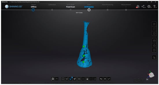 As mentioned before, the EinScan Pro 2X portable 3D scanner by Shining 3D (Hangzhou, China) was used for data acquisition. This device was selected due to its versatility in capturing complex geometries, its high scanning accuracy (up to 0.04 mm in fixed scan mode), and its ability to operate in both handheld and stationary configurations, which was essential given the varying shapes and surface details of the artifacts. For the scanning parameters, we used structured light scanning mode with a resolution setting of 0.2 mm to balance detail capture and processing efficiency. The exposure time and sensitivity settings were adjusted based on surface reflectivity, particularly for the glass vessel, where a chalk spray was applied to reduce reflections and improve data acquisition. Multiple scans were taken from different angles and later merged to ensure complete surface coverage.