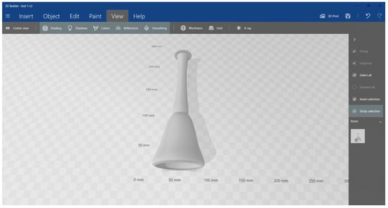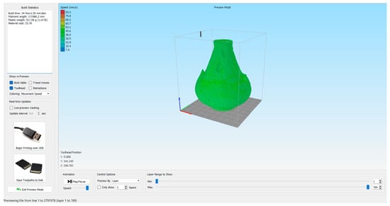 In the case of the humanoid vessel AMAL 2131, Figure 11 and Figure 12 illustrate the corresponding 3D print preparation process through the introduction of the 3D model into the corresponding Simplify3DTM v.4.1.2slicing software of the 3D printer, as acquired from the 3D scanning process. Figure 13 shows the final 3D-printed scaled replica.