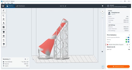 This image shows information about the 3D printing process such as completion times (4 h and 45 min), the amount of construction material (5.69 mL) as well as the number of layers that make up the total volume of the object. In this case, adaptive layer thickness was chosen, where the printer selects the optimal layer thickness in different areas of the object using digital intelligence (A.I.) technology. The adaptive layer thickness option in an SLA resin 3D printer offers several important advantages that enhance the quality and efficiency of the printing process. This approach allows for variable layer heights throughout the print, allowing thicker layers in less detailed areas and thinner layers in areas that require high precision and fine detail [18]. As a result, adaptive layer thickness optimizes print time while maintaining complex model features, reducing material consumption without compromising quality [19]. This option results in improved surface finishes and better overall accuracy on complex geometries, making it particularly beneficial for applications where detail is paramount, such as jewelry design, dental models, and complex prototypes. Additionally, the ability to adjust layer thickness based on model requirements helps minimize the risk of print failure, leading to higher success rates and more reliable results. Overall, applying adaptive layer thickness to SLA 3D printing not only optimizes the workflow, but also enhances the fidelity and visual appeal of the final object [20].