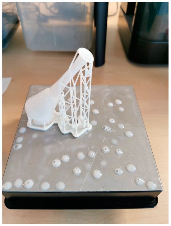 Correspondingly in Figure 7, the supporting structures (supports) are depicted with a view of thin pillars. The choice of support density and placement in an SLA resin 3D printer is critical to achieving successful prints while minimizing material waste and post-processing efforts [21]. Props are essential for protrusions and complex geometries, and their density can be adjusted based on the specific needs of the model. A higher support density provides robust stability for complex designs, preventing distortion during the printing process, but may increase material usage and require more extensive cleanup after printing [22]. Conversely, a lower support density reduces hardware consumption and simplifies post-processing, but may risk insufficient support for sensitive features. Additionally, strategic placement of supports is essential. Optimal placement can enhance stability while minimizing the effect on the final surface finish of the printed part. By carefully considering both support density and placement, users can effectively balance strength and ease of removal, ensuring that the final print maintains its intended quality without unnecessary imperfections or damage from support structures [23]. Accordingly, Figure 8 depicts the object immediately after the completion of the printing process, before its removal from the platform.