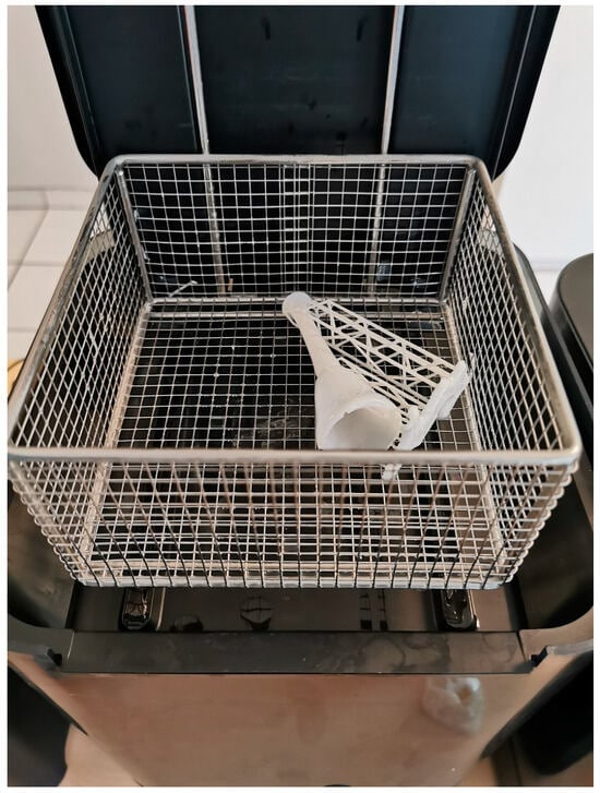 Then, the object was immersed in a cleaning device with isopropyl alcohol (IPA) solvent in order to clean it of residual resin that had not undergone polymerization. Figure 9 illustrates the object in the process of initial placement in the aforementioned device.