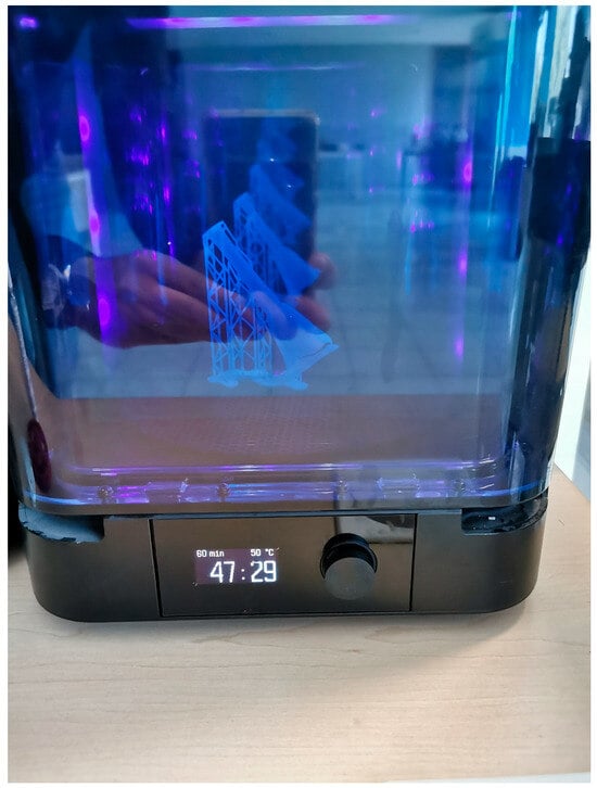 The object was then advanced into a UV irradiation device. Exposing an object to UV radiation after it has been 3D printed using a 3D SLA (stereolithography) printer is an essential step in ensuring the final properties of the printed object, including strength, durability, and stability [24]. As mentioned above, SLA 3D printing works by using a UV laser to solidify a liquid resin layer by layer, resulting in a solid 3D object. However, this initial curing process during printing does not fully solidify the resin, leaving it partially reactive and susceptible to structural weaknesses. Post-print curing, which usually involves exposing the object to additional UV radiation, completes the polymerization process, thereby stabilizing and hardening the printed object.