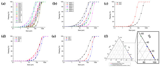 (a) Particle size distribution of the aggregates from whole samples, (b–e) particle size distribution of the aggregates grouped by heritage site, and (f) ternary plot according to Folk’s classification.