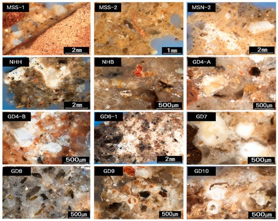 A comparative analysis of the cross-sections of samples collected from the Namhansanseong Fortress revealed similar microstructural characteristics across all samples (Figure 4). Commonly observed features include the presence of binder along with clay minerals, as well as sub-angular to angular quartz, feldspar, and mica particles. Additionally, some lime lumps and dolomite lumps were identified.