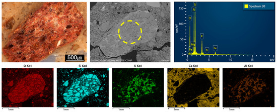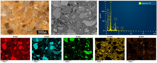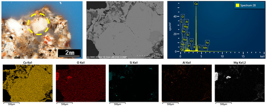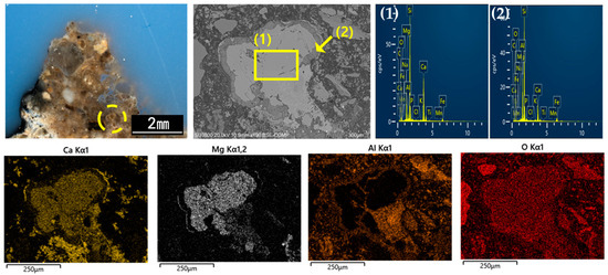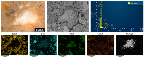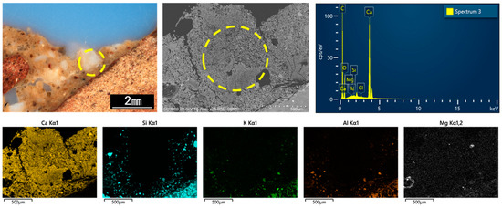 The samples collected from the Munsusanseong Fortress in Gimpo commonly exhibited the presence of binder along with sub-angular to angular quartz, feldspar, and mica particles (Figure 4 and Figure 5). Additionally, uncalcined lime lumps, possibly resulting from incomplete firing, were observed. These lime lumps were primarily composed of lime lumps with a high calcium (Ca) content (Figure 5 and Figure 6). However, some particles showed a lower Ca content and relatively higher magnesium (Mg) content, indicating the presence of dolomite (Figure 7). Unlike the other samples, MSS-1 contained Waseol, with its size ranging from 1 mm to 2 cm. SEM-EDS analysis of these fragments identified aluminum (Al), silicon (Si), and potassium (K) as the major components, with trace amounts of calcium (Ca) (Figure 8).