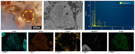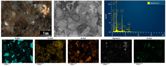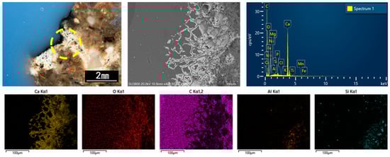 EDS mapping analysis indicated that certain dolomite particles exhibited a decrease in their magnesium (Mg) content at the outer edges compared to the interior, accompanied by an increase in the silicon (Si) and aluminum (Al) concentrations (Figure 9). This phenomenon is interpreted as de-dolomitization, a process frequently observed in ancient lime mortars, involving a possible precipitation of magnesium-aluminum-silicate-hydrate (M-A-S-H) or magnesium-silicate-hydrate (M-S-H) compounds. This reaction likely occurred in the alkaline environment of the mortar, facilitated by the decomposition of dolomite and its interaction with silica- and aluminum-rich clay minerals present in the mortar [35,36,37,38,39,40,41] Furthermore, black charcoal particles with visible wood cellular structures were observed (Figure 10). EDS analysis revealed a high concentration of calcium (Ca) in these particles, which is interpreted as the result of Ca filling the organic cell structures. These charcoal particles are thought to have been incorporated into the mortar because of the layered firing technique used in the late Joseon dynasty kilns, where lime and charcoal were alternately stacked and fired [42].