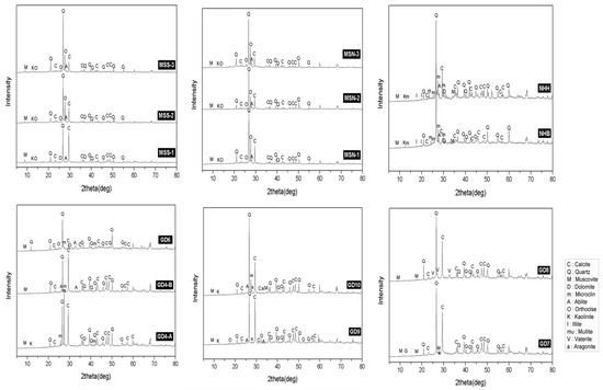 To determine the mineral composition of the Joseon dynasty lime mortar, XRD analysis was conducted. Calcite was commonly identified as the primary mineral component of the binder in all samples (Figure 14), indicating complete carbonation in all tested cases.
